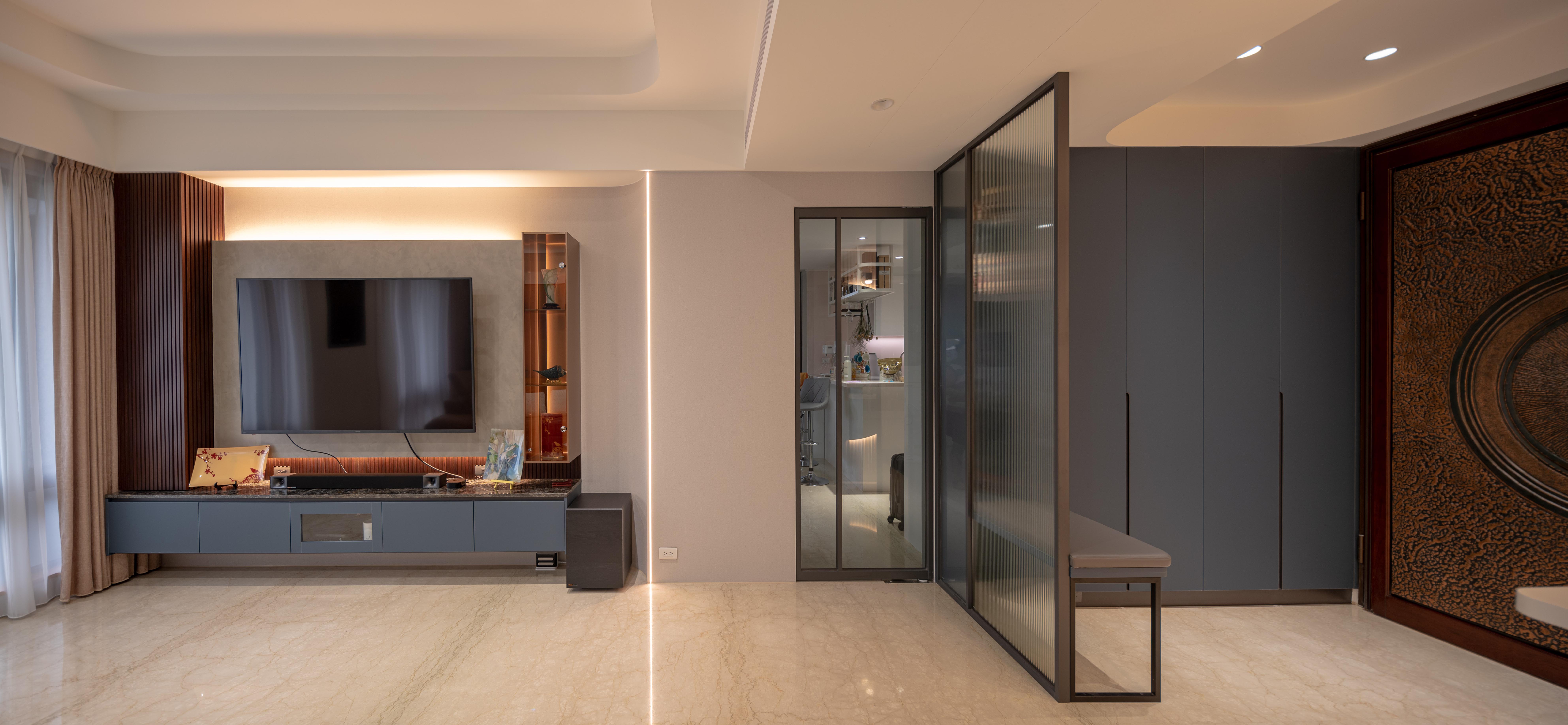 本案位於台北松山區,設計核心以「簡約溫潤」為主,透過木質、石材與清水模等異材質交錯,賦予空間多層次的表情。大面積窗景搭配木百葉,引入自然光線並能靈活調節光影,讓居家隨時間變化而呈現不同氛圍。